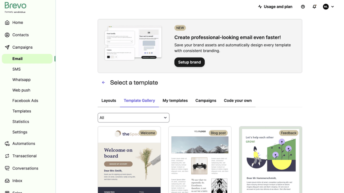 Brevo's email editor offers around 45 polished templates organized by campaign type — welcome sequences, promotions, newsletters, re-engagement.