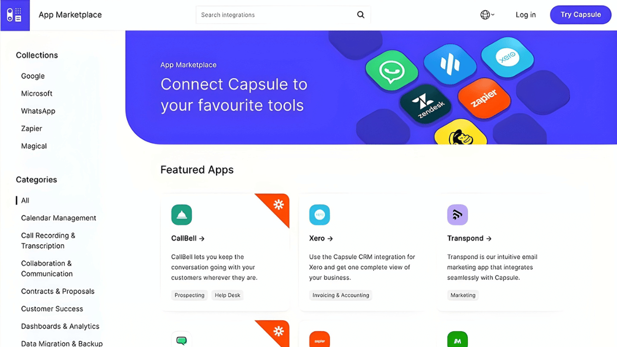 Capsule integrates with 60+ tools — including the ones that actually matter for small businesses.