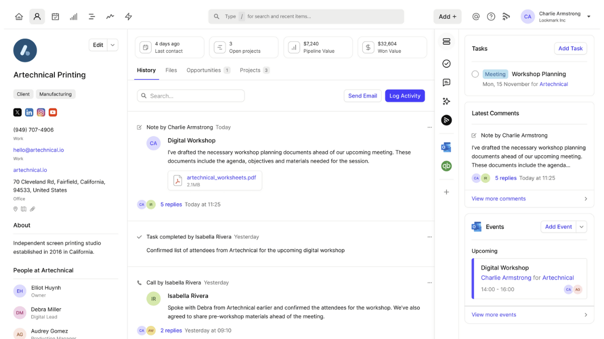 The Xero/QuickBooks integration is particularly valuable here. See billing status alongside relationship history.